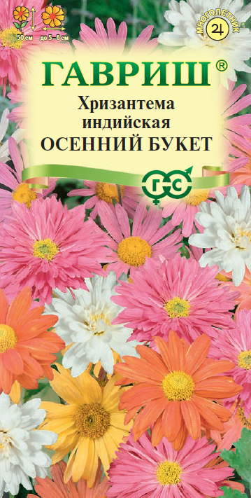 Многолетнее прямостоячее растение из семейства Сложноцветные высотой до 50 см. Соцветия простые, полумахровые и махровые, разнообразных оттенков, 5-6 см в диаметре. Хризантема индийская относится к группе поздноцветущих декоративных культур (цветение — с августа по октябрь) и благодаря своим ярким краскам освежит осенний пейзаж. Растение светолюбивое и холодостойкое, достаточно засухоустойчивое. Предпочитает легкие плодородные почвы с добавлением извести. При выращивании через рассаду семена высевают в ящики в марте — апреле, прямой посев в грунт возможен в начале мая. При температуре почвы 15°C всходы появляются через 7 -15 дней. В грунт растения высаживают в мае, выдерживая расстояние 30-35 см. Используют на клумбах, в миксбордерах, для срезки.