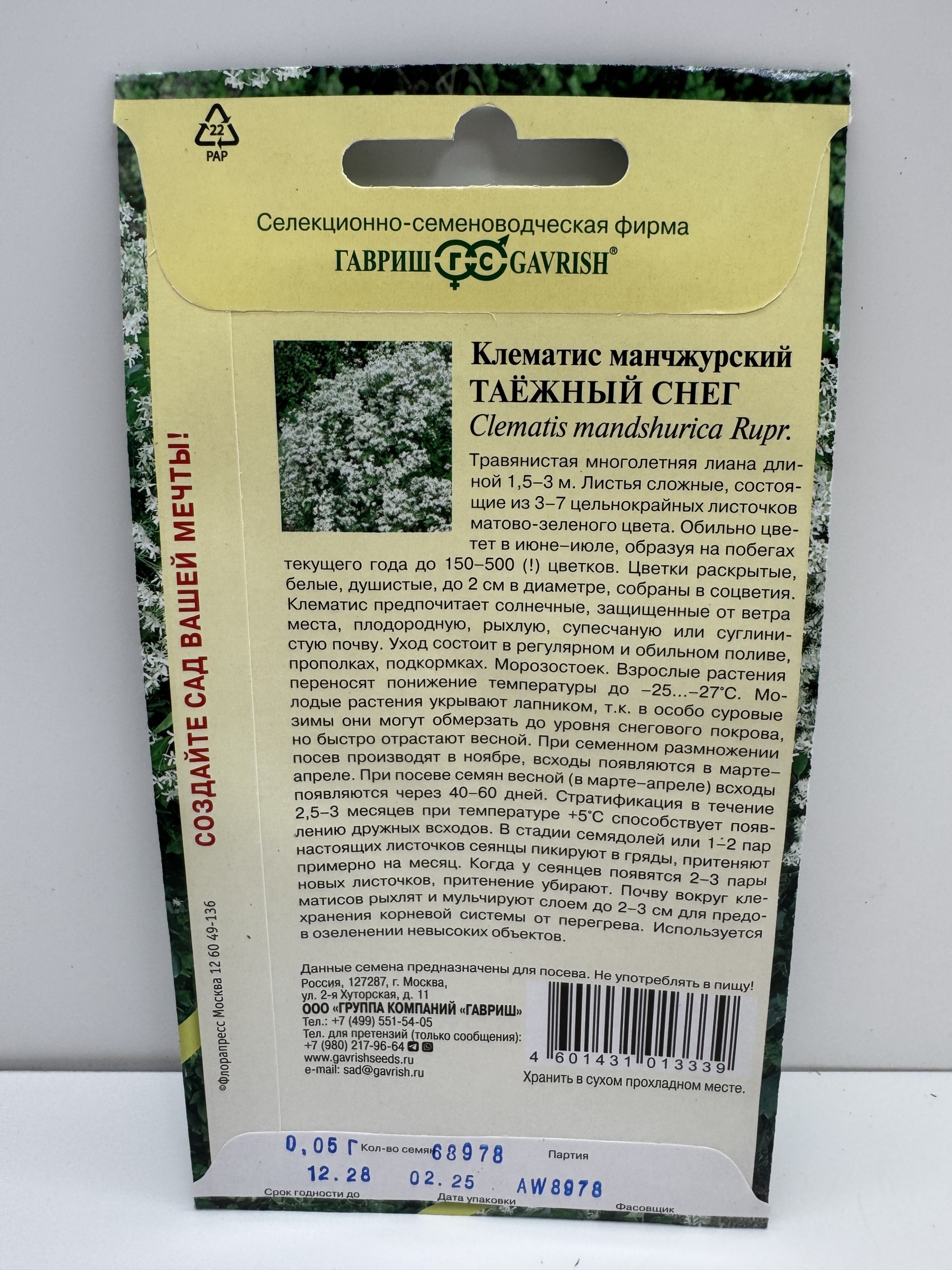 Главная Семена ЦВЕТЫ Цв.Клематис Таежный снег (Гавриш)