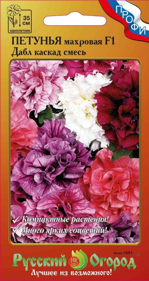 Дабл каскад – серия крупноцветковых махровых петуний, для которых характерен компактный куст с хорошим ветвлением и небольшими аккуратными листочками. Цветки густомахровые, с сильно гофрированными лепестками, 10-13 см в диаметре. Цветущее растение имеет необыкновенно эффектный вид. Растения данной группы используются в оформлении клумб, вазанов, балконных ящиков. Характеризуется пышным, длительным и обильным цветением. Компактные, хорошо разветвленные растения сплошь покрыты 100% махровыми крупными цветками. Характеризуется обильным и длительным цветением.