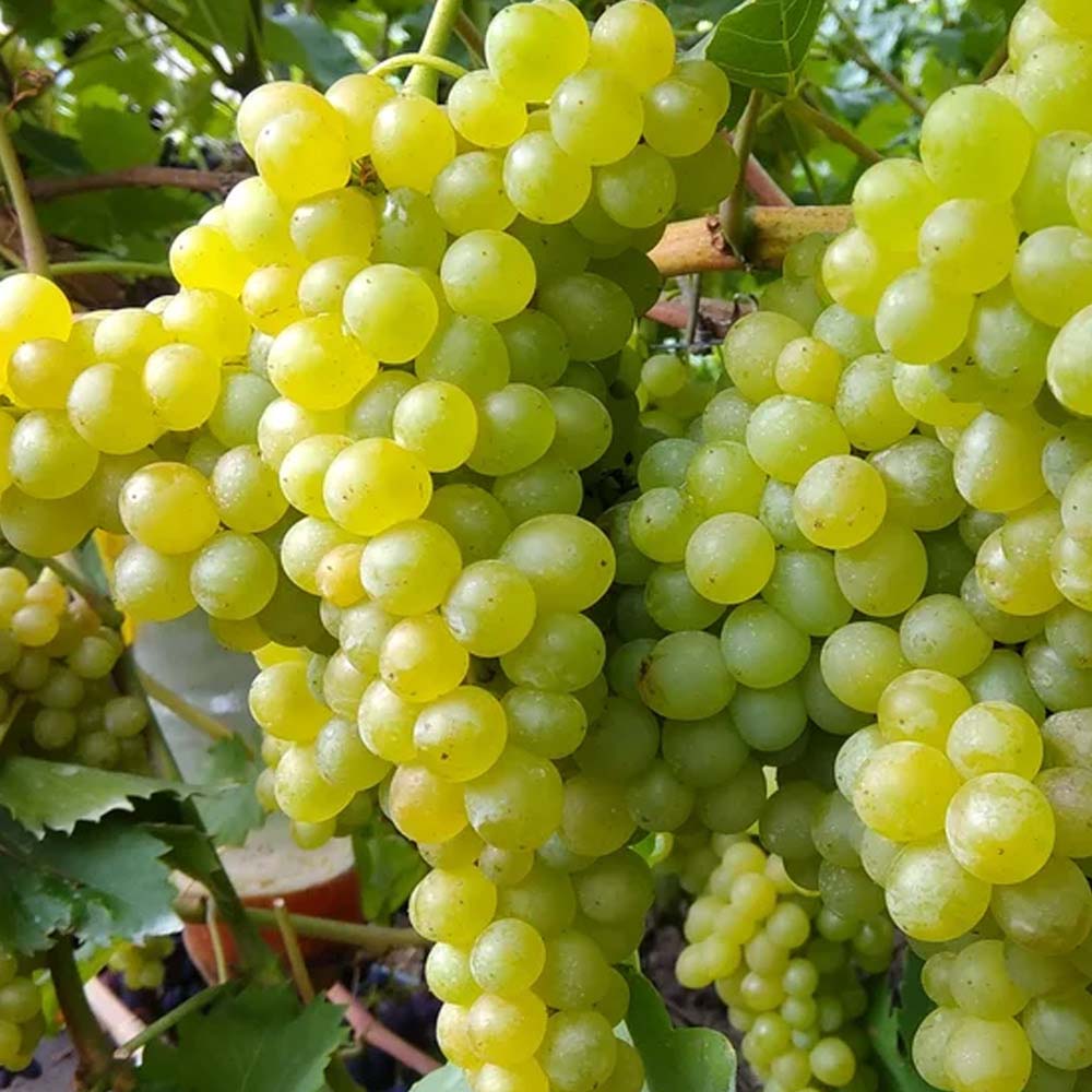 Виноград с очень ранними сроками созревания и коротким периодом вегетации – для технической зрелости культуре достаточно от 100 до 115 дней. Куст сильнорослый, хорошо разветвленный и высокий. Размеры гроздей средние и крупные (400-900 грамм). Ягоды овальной формы, среднего размера, масса 3-4г. Кожица зеленовато-желтая, тонкая, но плотная. В мякоти нет ни косточек, ни рудиментов.