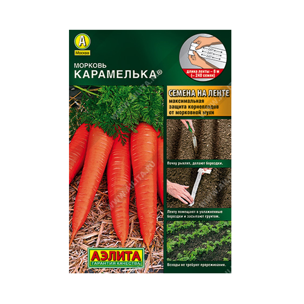 Семена на ленте – очень просто и удобно! Семена тщательно подготовлены к посеву и находятся между двумя тонкими слоями ленты, полностью растворимой во влажной среде. Материал ленты – 100% целлюлоза, не содержит клея. Технология запатентована. Общая длина ленты – 8 м. Лента состоит из трех частей. Перед использованием их нужно отделить друг от друга и расправить. Длина каждой части – 2,67 м. На каждой части располагаются ? 80 семян моркови (всего ? 240 шт.).Посев: почву разрыхляют. Ленту помещают в хорошо увлажненные бороздки на подготовленной грядке, на глубину 1,5-2 см и засыпают грунтом, поливают. ДО ПОЯВЛЕНИЯ ВСХОДОВ ГРЯДКУ НАКРЫВАЮТ ПЛЕНКОЙ, ПОДДЕРЖИВАЯ ВЕРХНИЙ СЛОЙ ПОЧВЫ ВО ВЛАЖНОМ СОСТОЯНИИ (НЕ ДОПУСКАЯ ПЕРЕСЫХАНИЯ ЛЕНТЫ). Благодаря идеальному расположению семян на ленте (на расстоянии 3-3,5 см) всходы не требуют прореживания, и растения могут равномерно развиваться. Это сводит к минимуму повреждение корнеплодов морковной мухой, так как ее привлекает запах морковной ботвы, усиливающийся при прореживании. Дальнейший уход заключается в прополках, поливах и рыхлении почвы. Наслаждайтесь сладкой и здоровой морковью со своего огорода!